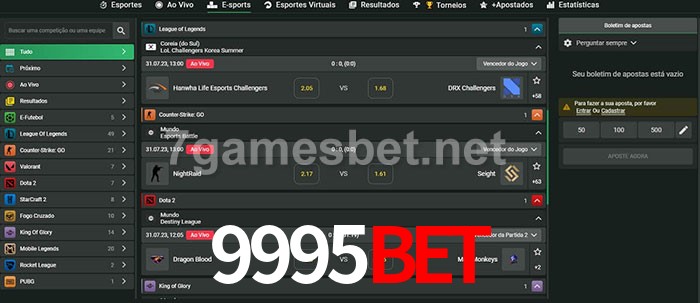 O 9995Bet oferece uma grande seleção de opções de apostas em e-sports com probabilidades competitivas
